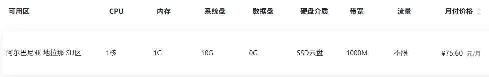 这款云服务器在阿尔巴尼亚地拉那区,配置是1核CPU,内存1G,系统盘是10G,数据盘没有额外空间,硬盘用的是SSD云盘,速度挺快的。带宽是1000M,也就是1Gbps,流量不限,每个月价格是75.6元人民币。