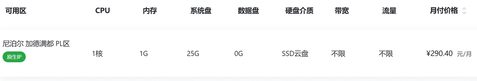 从上图可以看到,这款云服务器位于 尼泊尔加德满都 PL区,它的详细配置如下: