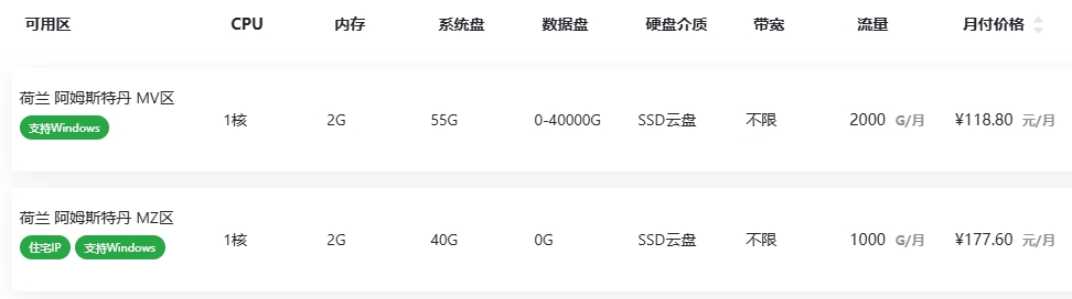 荷兰云主机在全球范围内也颇受欢迎,根据上图,我们可以看到两个不同配置的荷兰云主机:第一款主机:CPU:1核内存:2G系统盘:55G数据盘:0-40000G(可扩展)硬盘类型:SSD云盘带宽:不限制流量:2000G/月月付价格:118.80元第二款主机:CPU:1核内存:2G系统盘:40G数据盘:0G硬盘类型:SSD云盘带宽:不限制流量:1000G/月月付价格:177.60元
