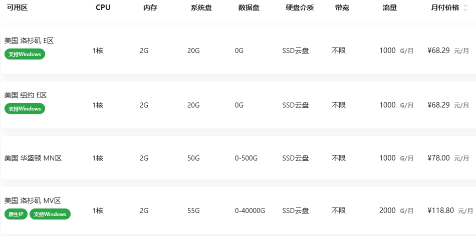 从上面的数据可以看出,1核2G的美国云主机价格在68.29元到118.80元之间,具体价格取决于地域和配置的不同。例如,洛杉矶E区和纽约E区的价格是最低的,而洛杉矶MV区虽配置相对较高,但价格也相应上涨。